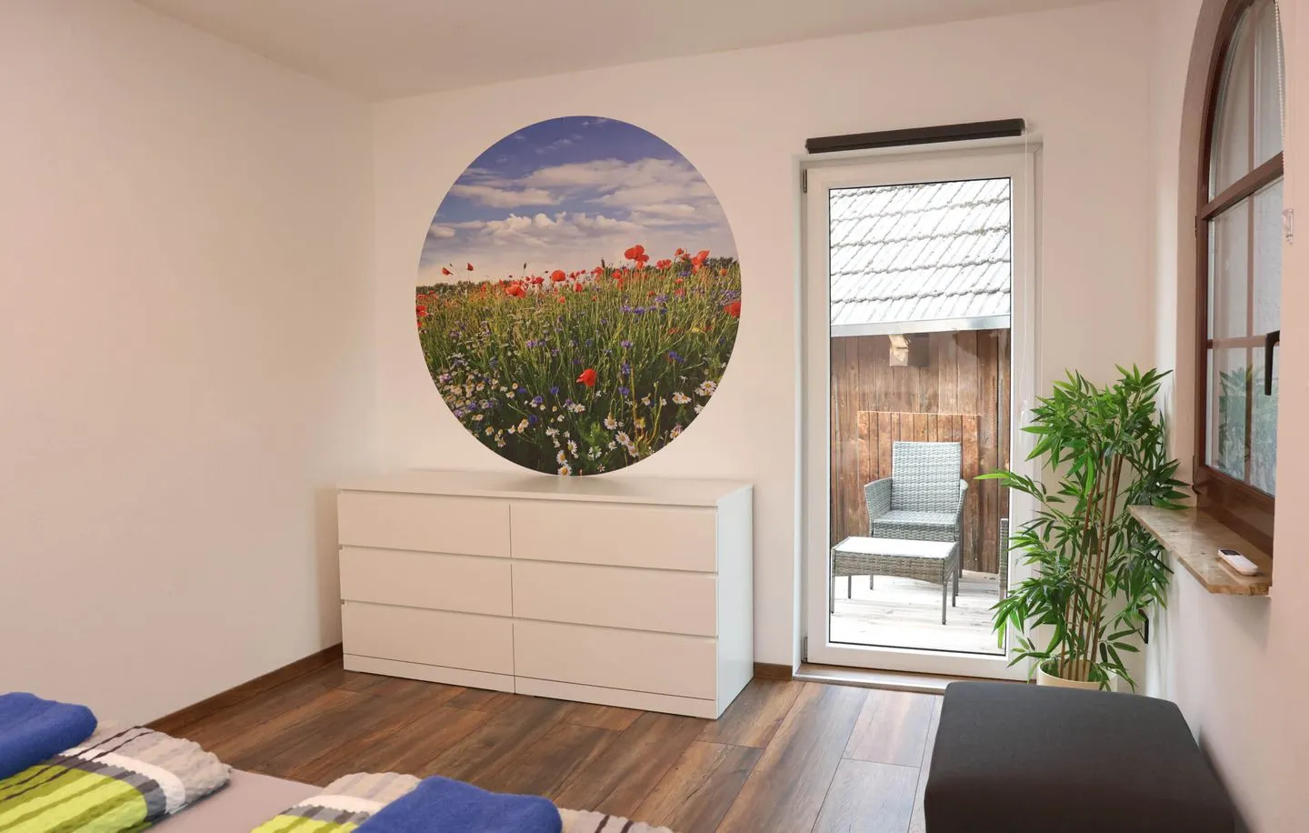 Das gemütliche Schlafzimmer ist mit einem komfortablen Doppelbett ausgestattet und verspricht erholsame Nächte. Im Wohnzimmer finden Sie eine ausziehbare Doppelbettcouch sowie einen Sat-TV, der für entspannte Abende sorgt. Die kleine, gut ausgestattete Küchenzeile bietet alles, was Sie für die Zubereitung kleiner Mahlzeiten benötigen, einschließlich Kochutensilien, Geschirr und einer Kaffeemaschine. Das moderne Bad verfügt über eine Dusche und ein WC, sodass Sie sich wie zu Hause fühlen können. Weiterhin bietet eine neu geschaffene Terrasse den Blick auf die grüne Umgebung.