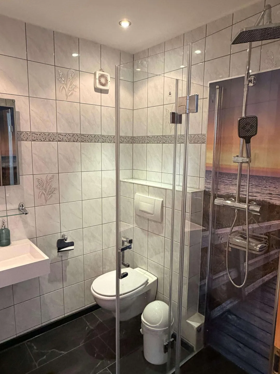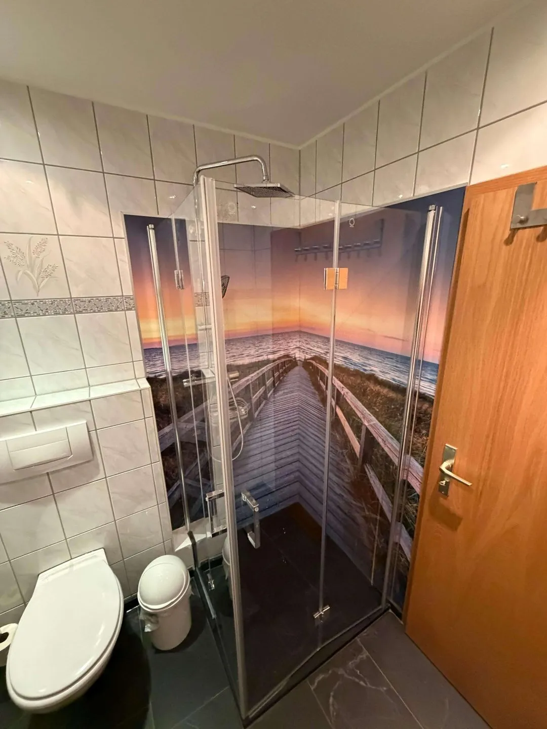 Das jüngst modernisierte Bad verfügt über eine Dusche mit Fotorückwand und WC. Eine praktische Ausstattung wie Fön und Handtücher sorgen für Komfort während des Aufenthalts.